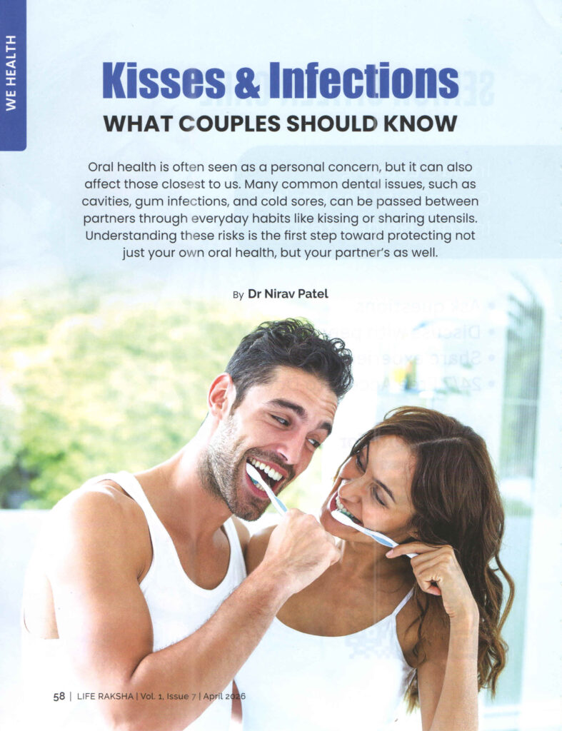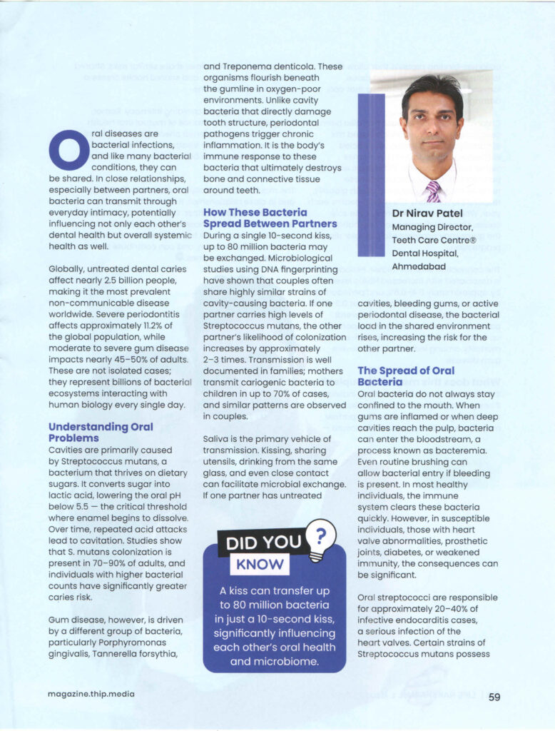 Dentist from Ahmedabad Dr. Nirav Patel featured in a leading magazine for his insights on modern dental science.He highlights how oral health is not just personal—but shared between partners.