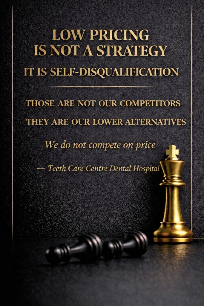 LOW PRICING IS NOT A STRATEGY. IT IS SELF-DISQUALIFICATION. THOSE ARE NOT OUR COMPETITORS. THEY ARE OUR LOWER ALTERNATIVES. We do not compete on price — Teeth Care Centre Dental Hospital