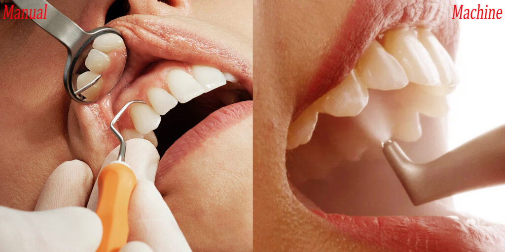 Teeth scaling can be performed by two in-clinic (professional) methods: